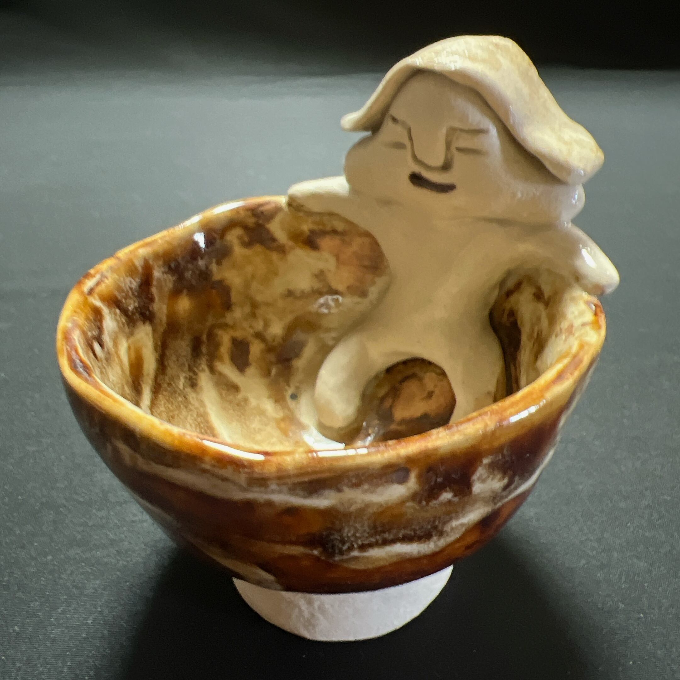 人面草紙が湯船につかっているようなぐい呑み 妖怪陶器
