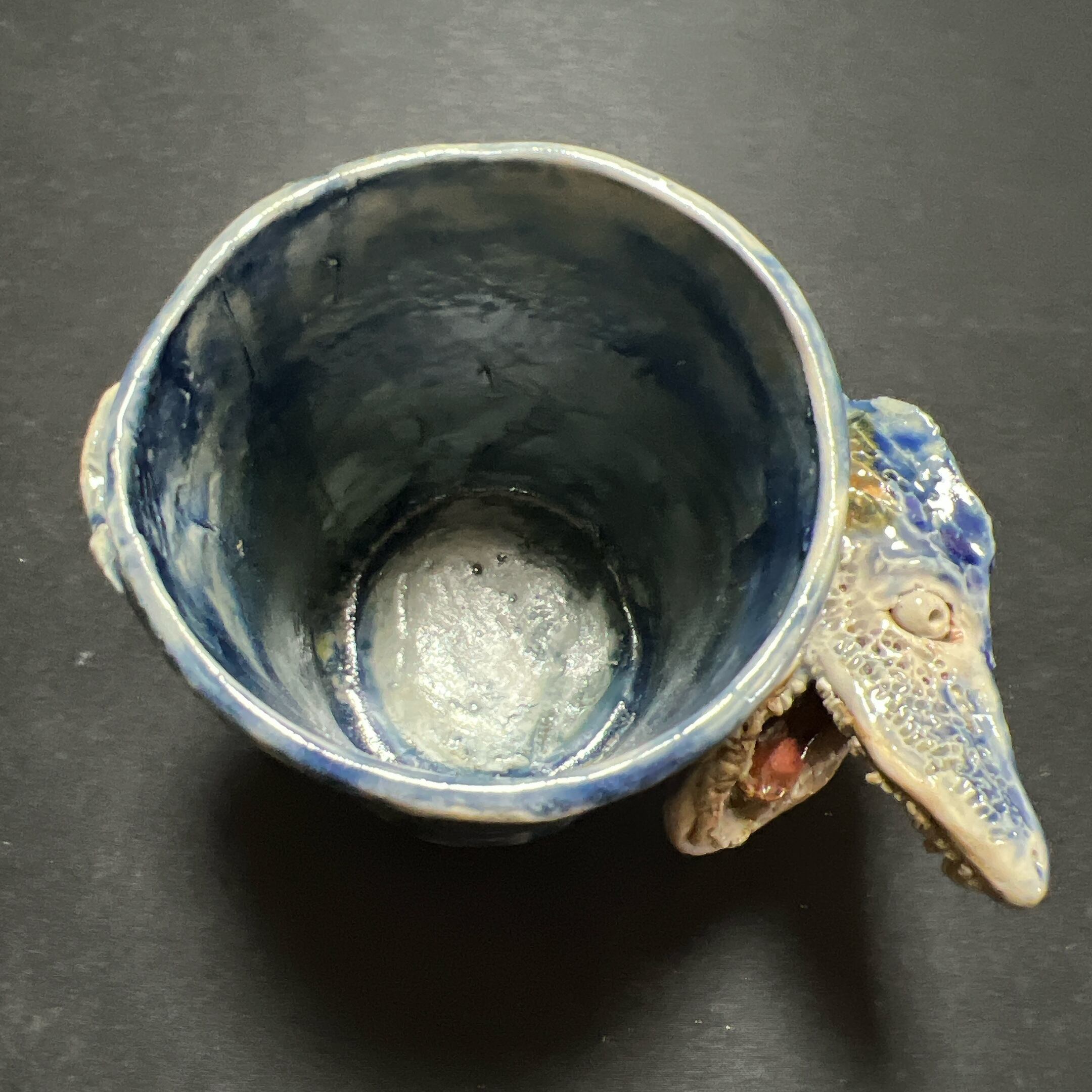 海に出没する影鰐の仲間である怪魚の一種で、歌川国芳の浮世絵にも描かれた鰐と鮫が合体したかのような容姿の妖怪、鰐鮫をインスパイアした1点モノの湯呑み(マグカップ)です。
